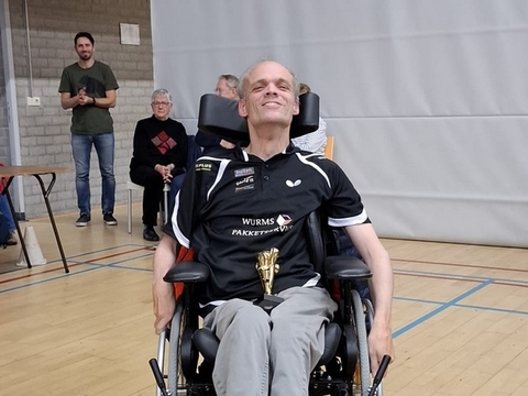 Martijn de schuiftafeltennisser van Hercules en Nederlands Kampioen zat in een poule van 3, en moest 2 wedstrijden vol aan de bak maar het ging toch makkelijk want van Henk won hij met 2-0 (11-2, 11-5) en vervolgens van Aniek ook met 2-0 (11-4, 11-4). En zo ging Martijn naar de halve finale waar hij Mark tegen kwam en de eerste game een spannende werd 11-9 maar daarna ging het gas erop bij Martijn en won hij met 11-1 waar een finale plaats stond te wachten. Liduin was daar de tegenstander maar Martijn begon voortvarend en won met 11-6 maar wat niemand had verwacht Martijn VERLIESD een game met 9-11 (achteraf zei hij al, ik maakte 7 fouten door de bal te hoog in het net te spelen) maar Martijn was niet van slag te brengen en won beslissende game ruim met 11-5 en zo is hij weer een titel rijker.