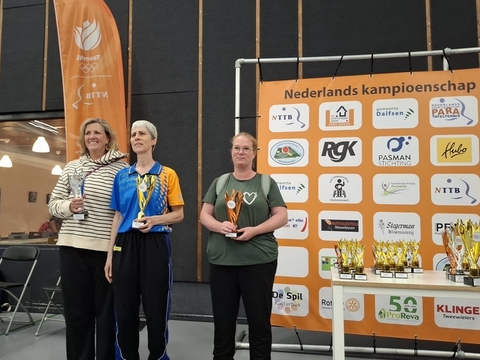 17 spelers verdeeld over 4 poules dat was de uitdaging voor Angelien. De poulefase won Angelien haar drie partijen, de kwartfinale tegen Wouter won ze in de vijfde game met 13-11, pffff. De halve finale dat tegen het talentje Lara (11 jaar) en weer een marathon partij maar nu verloor Angelien met 9-11 in de vijfde game. Om de derde en vierde plaats tegen Mandy ging het WEER in 5 games maar nu won Angelien in 11-9 en dat betekende een derde plaats.
